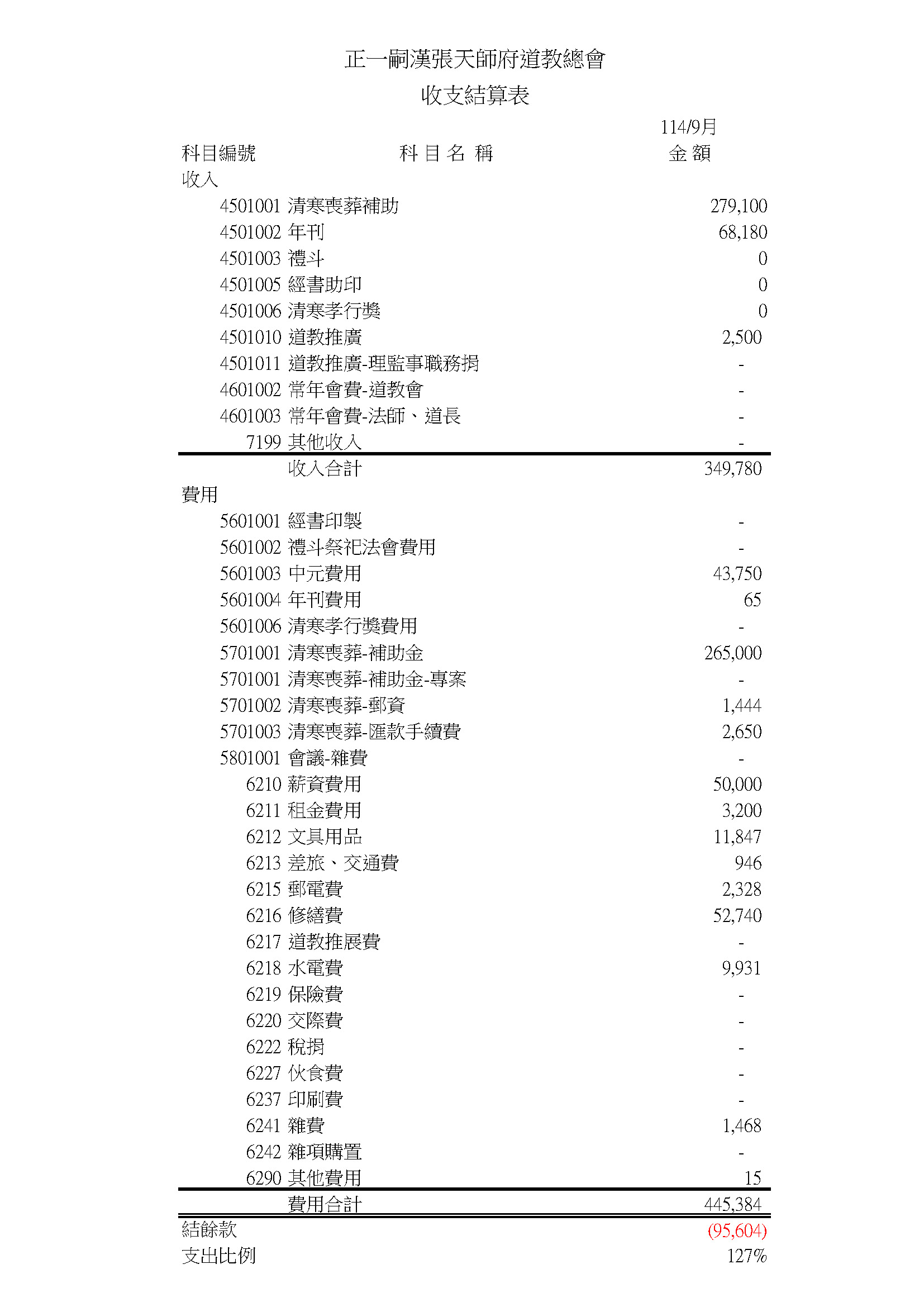 正一嗣漢張天師府道教總會 114年9月收支結算表