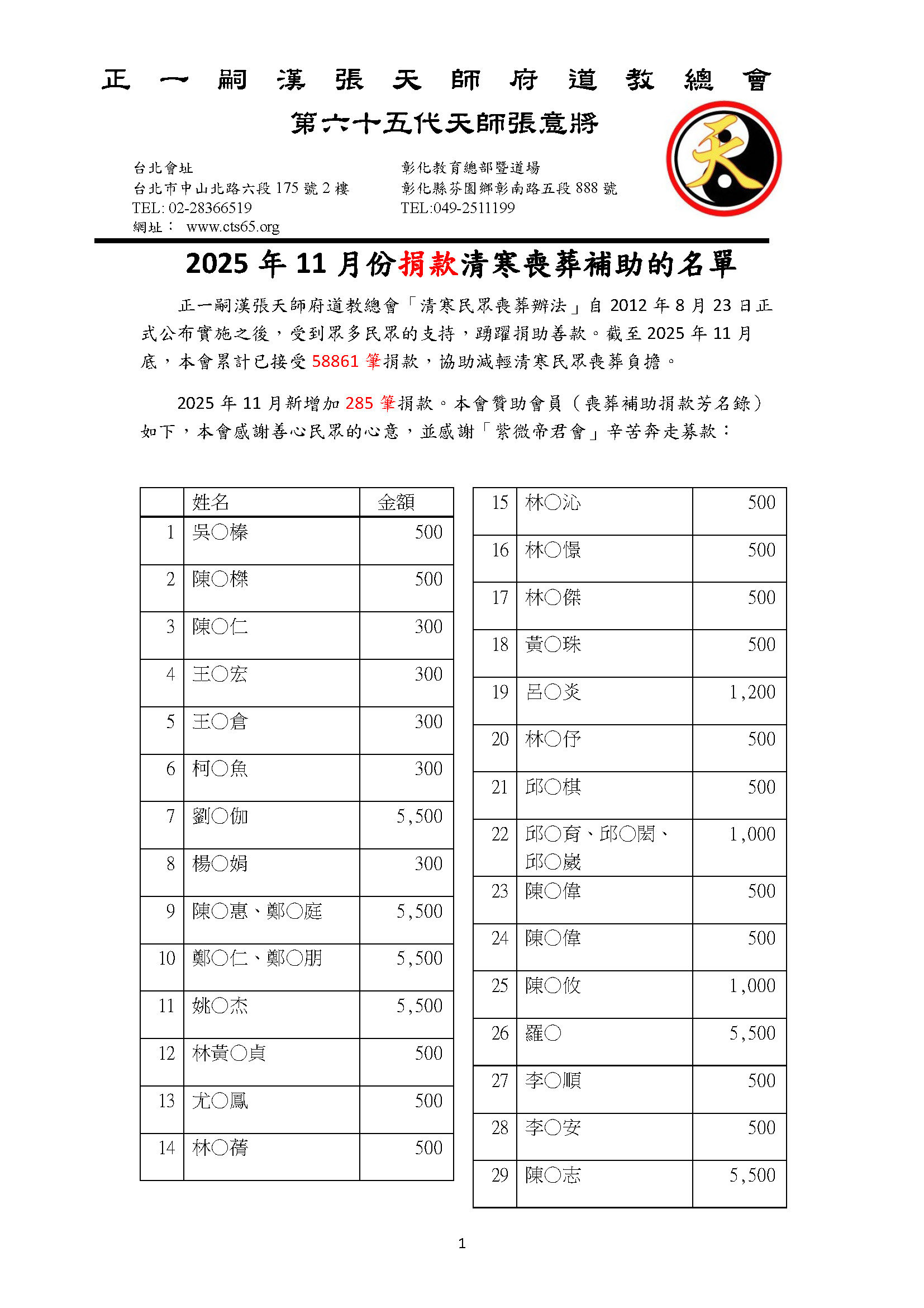 2025年11月份捐款張天師府清寒喪葬補助共285筆(累計58,861筆)