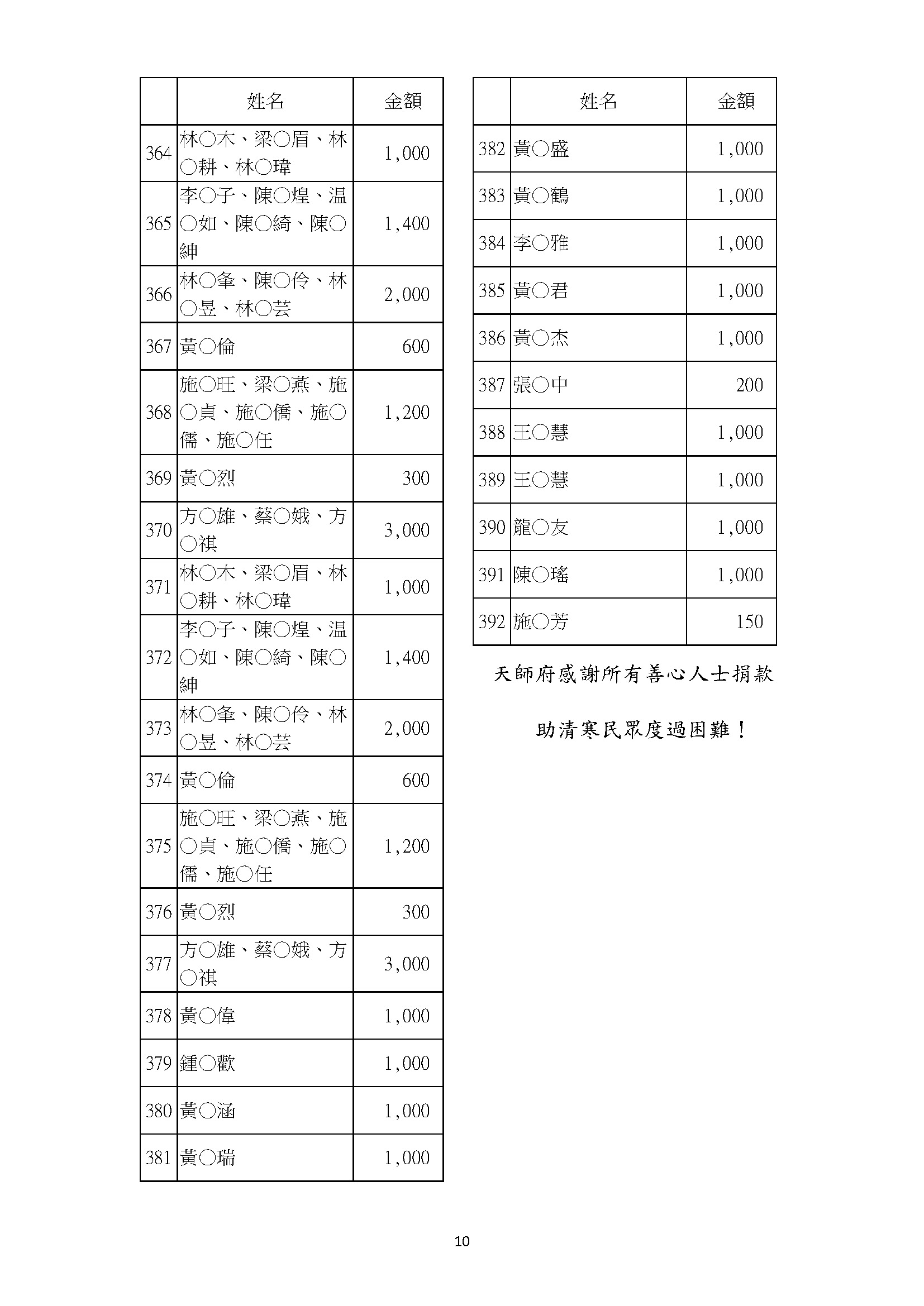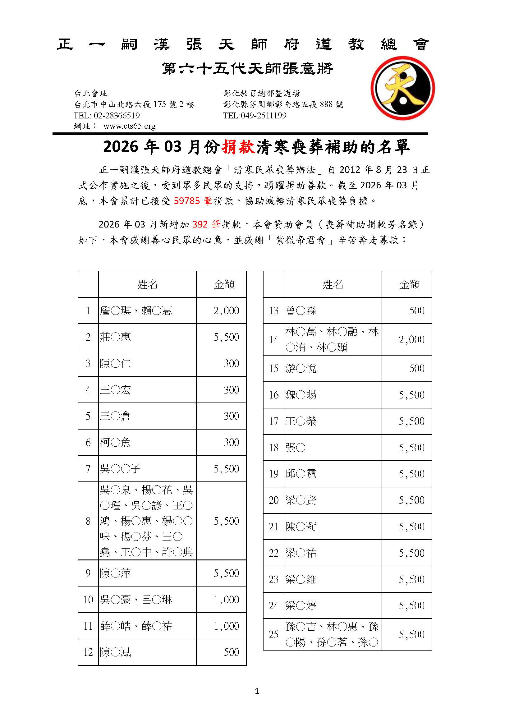 2026年3月份捐款張天師府清寒喪葬補助共392筆(累計59,785筆)