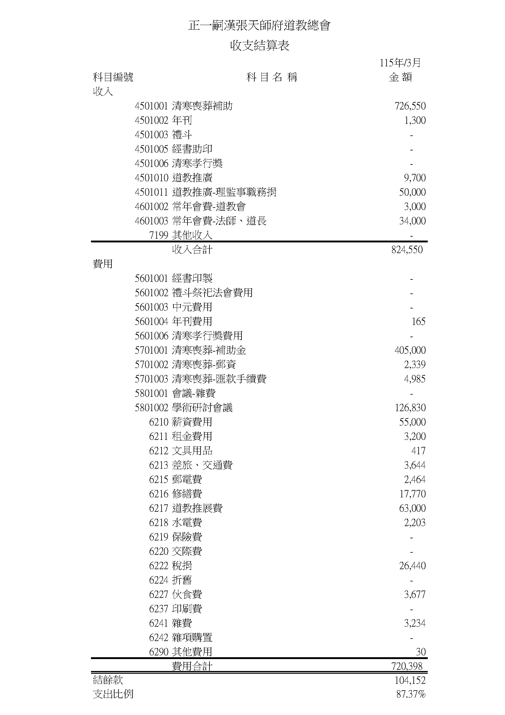 正一嗣漢張天師府道教總會 115年3月收支結算表