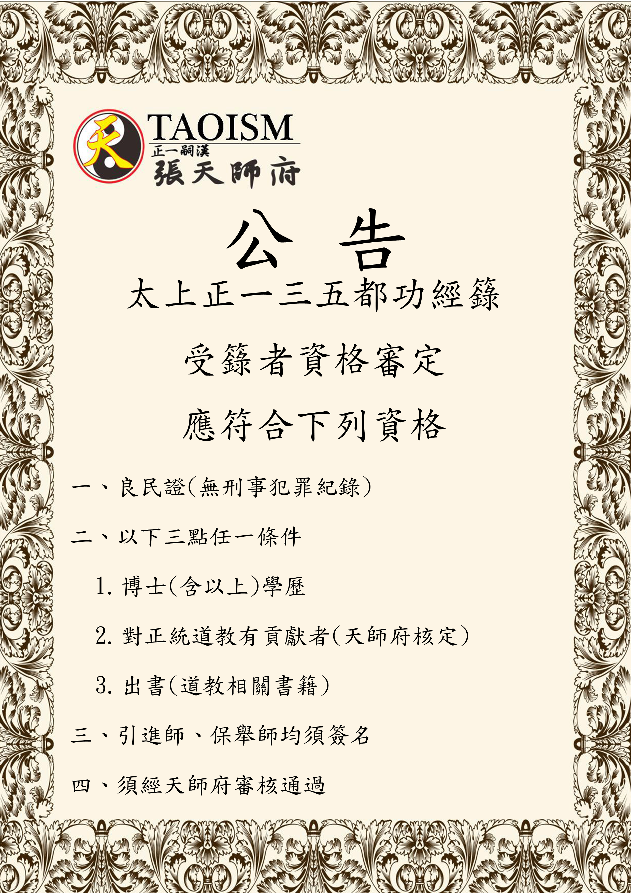 【太上正一盟威經籙】授籙之資格審核,除滿足資格外,需於本府在各大學(國立高雄師範大學、國立台南大學、國立台中教育大學、國立陽明交通大學),彰化教育總部開設之正統道教課程,修業時數滿100小時以上。