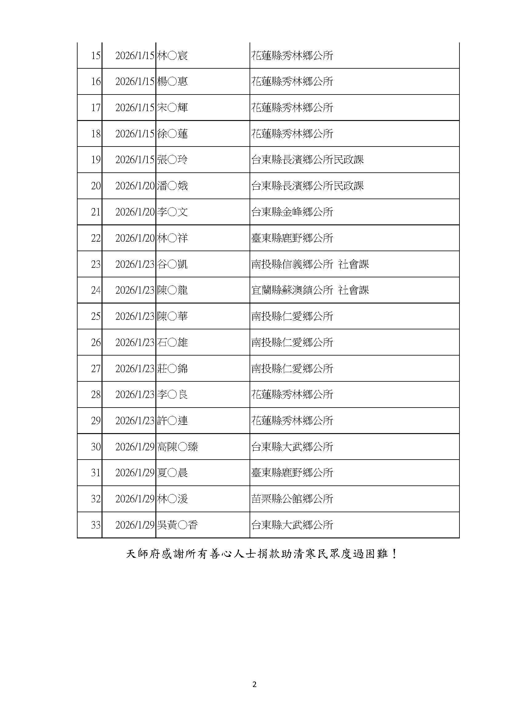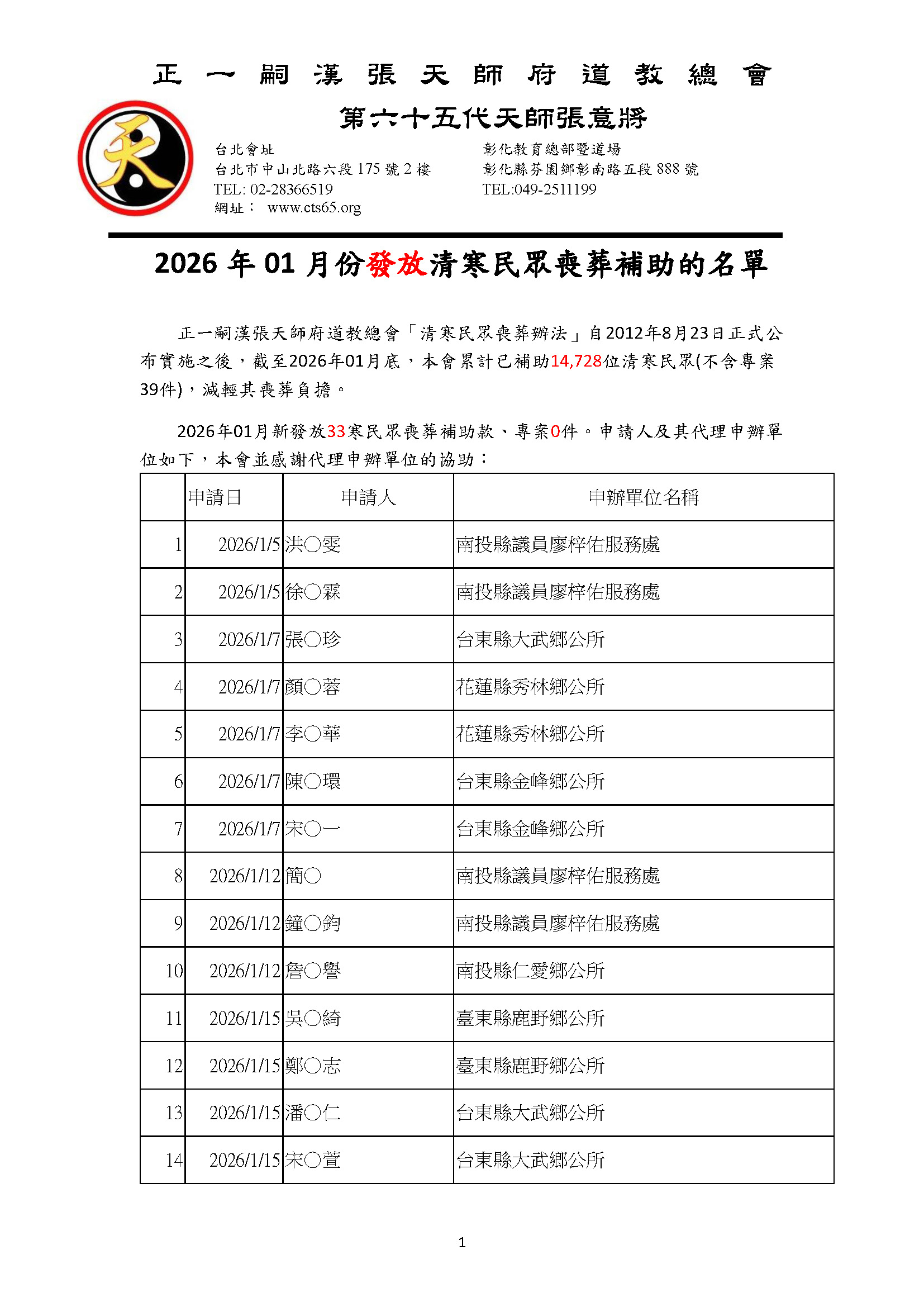 2026年01月張天師府補助33位清寒民眾喪葬,專案0位(累計補助14,728位,專案39件)