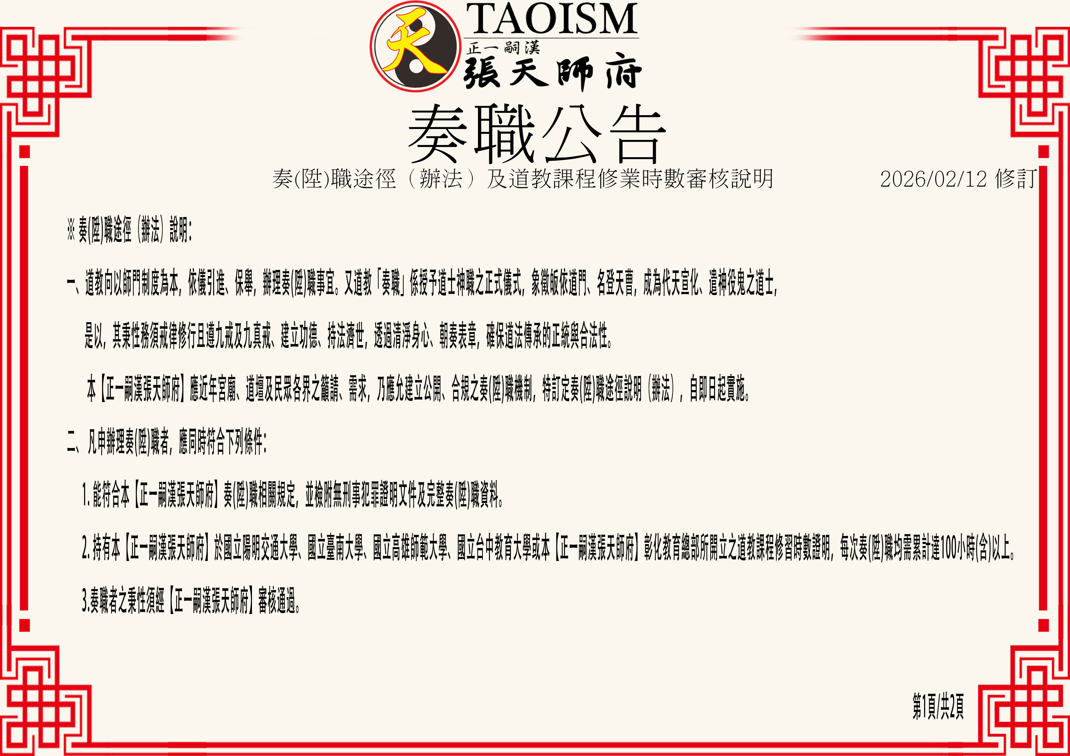 2. 持有本【正一嗣漢張天師府】於國立陽明交通大學、國立臺南大學、國立高雄師範大學、國立台中教育大學或本【正一嗣漢張天師府】彰化教育總部所開立之道教課程修習時數證明,每次奏(陞)職均需累計達100小時(含)以上。