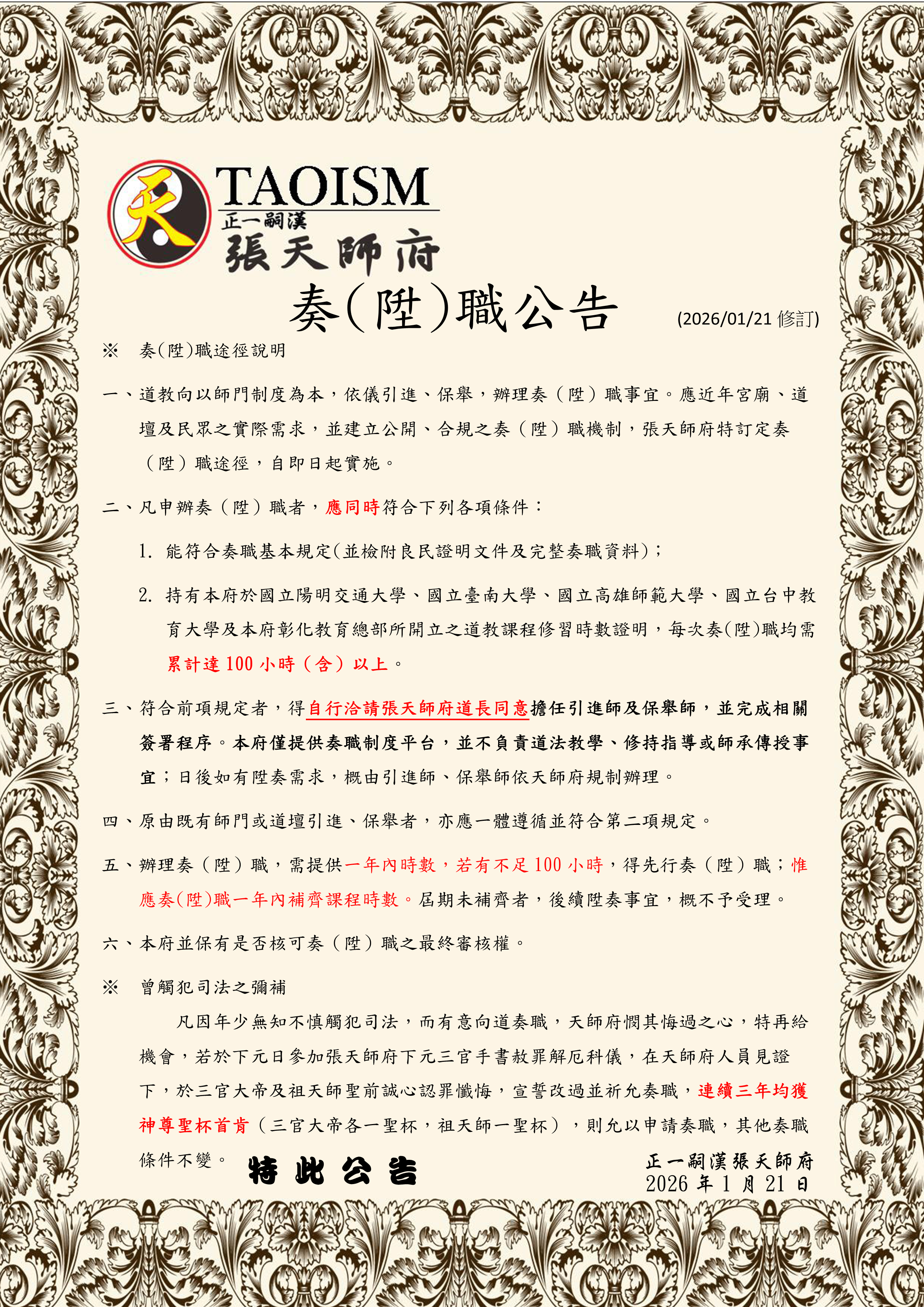 特 此 公 告 正一嗣漢張天師府 2026年1月21日