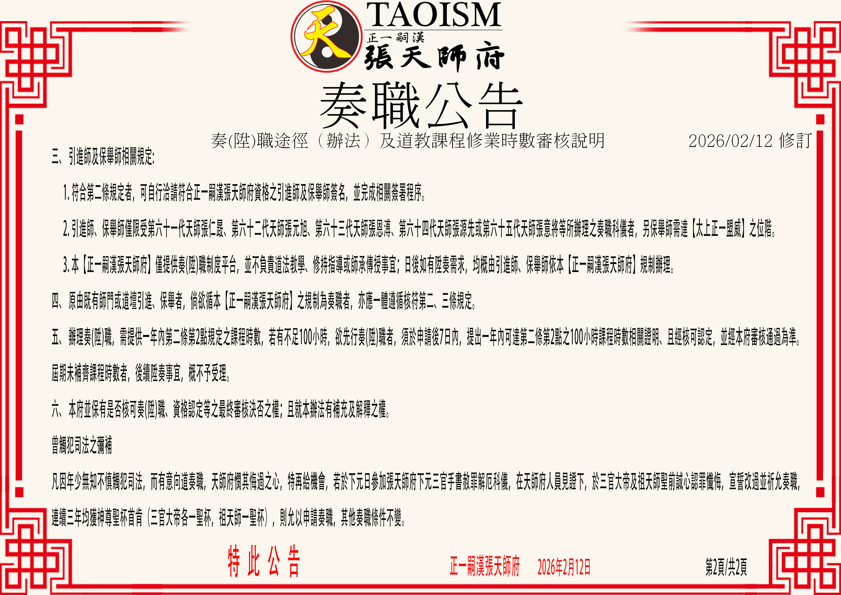 特 此 公 告 【正一嗣漢張天師府】 2026年2月12日