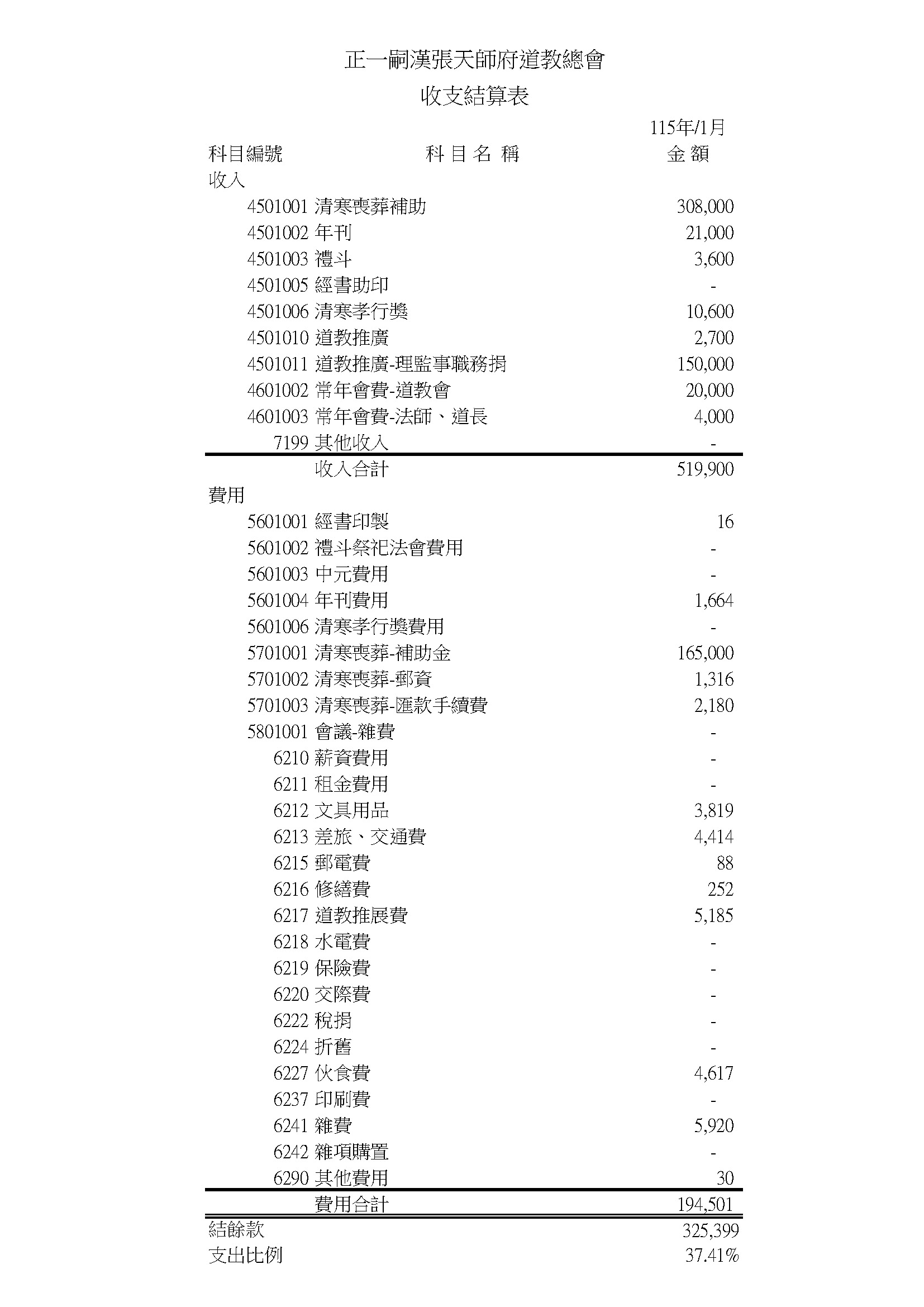 正一嗣漢張天師府道教總會 115年1月收支結算表